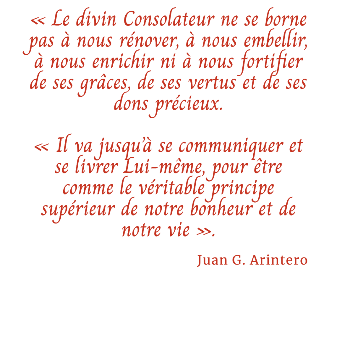 « Oh, Esprit Saint, lien divin qui unissez le Père et le Fils dans un ineffable et très étroit lien d’amour! Esprit de lumière et de vérité, daignez répandre toute la plénitude de vos dons sur ma pauvre âme, que je vous consacre solennellement pour toujours, afin que vous soyez son précepteur, son directeur et son maître.